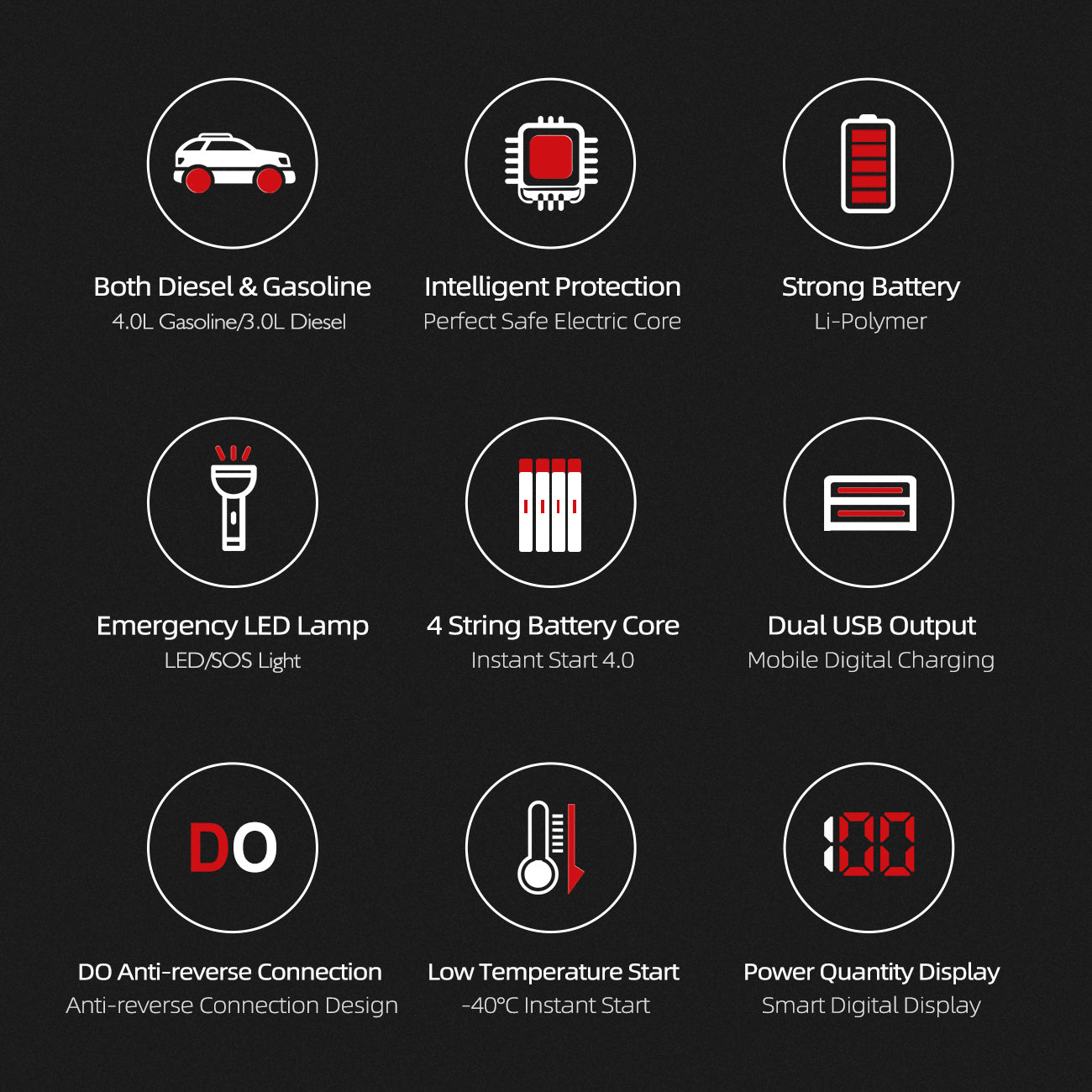 1.专治亏电:汽车应急启动电源,自力更生不求人 2.一机多用:汽车启动+手机充电+应急照明,全能出行装备; 3. 极寒启动挑战者:-30℃低温照样打火,北国车主的福音 4. 5分钟自救指南:备一个启动电源,就是备一份安心, 5.半夜下班,车又打不着?24小时私人救援车 6.长途自驾游,除了诗和远方,还得带上它——户外应急电源; 7.车子久放不开必亏电?放一个在手套箱,防范于未燃, 8.女司机也能轻松搞定的搭电神器,小巧不占地